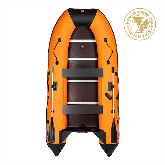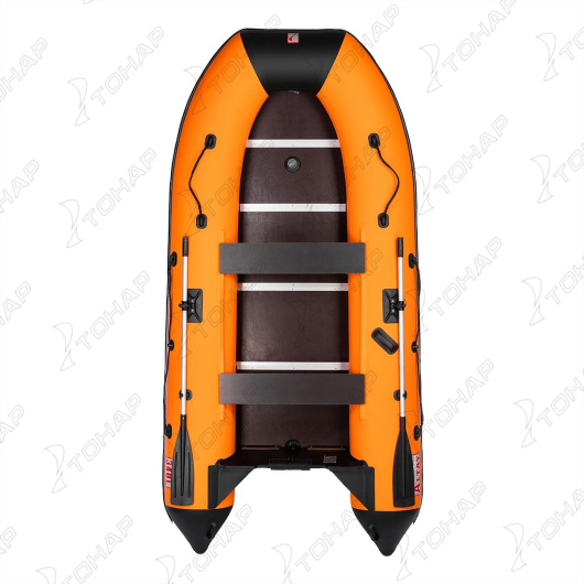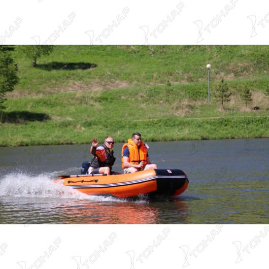 Описание Лодка Алтай 340L оранжевый/черный Тонар (0)Моторная лодка «АЛТАЙ 340L» производства компанией ТОНАР - это облегченная версия лодок серии "АЛТАЙ". Надежная конструкция выполнена из пятислойного армированного ПВХ плотностью 900 г/м2, три герметичных отсека гарантируют вашу безопасность на воде. Увеличенная килеватость обеспечивает исключительную управляемость лодки. Лодка плавно проходит волну и выходит в режим глиссирования за 4-5 секунд. Лодка имеет жесткий пол из влагостойкой фанеры толщиной 9 мм, который легко собирается при помощи специальных алюминиевых профилей и 2 стрингеров. Шерховатая поверхность пола позволяет устойчиво стоять в лодке. Лодка и пол компактно упаковываются в одну сумку, что позволяет перевозить лодку в багажнике любого автомобиля. Надувная моторная лодка АЛТАЙ 340L бренда ТОНАР стала победителем конкурса "Лучший товар года - Алтай 2025". Изделие прошло многоступенчатую проверку специалистами Роспотребнадзора, Росстандарта, Союза промышленников Алтайского края, Алтайского ЦСМ, Торгово-промышленной палаты на безопасность, качество изготовления, соответствие ГОСТ. Эксперты высоко оценили качество производства, современные материалы и эргономику лодки. Характеристики лодки «АЛТАЙ 340L»: Длина наибольшая - 340 см. Ширина наибольшая - 169 см. Длина кокпита - 235 см. Ширина кокпита - 75 см. Диаметр баллона - 47 см. Давление в баллонах - 0,24 бар. Число надувных элементов - 3+киль. Грузоподъемность - 500 кг. Пассажировместимость - 4 +1 человека. Толщина транца - 18 мм. Толщина дна – 9 мм. Число банок - 2. Толщина банки – 18 мм. Масса изделия в комплекте - 47 кг. Размер упаковки - 113х71х36 см. Максимальная мощность двигателя - 15 л.с. Максимальный вес двигателя - 42 кг. Лодка поставляется со стандартным набором комплектующих: • Ножной насос 7 л. • 2 весла с держателями весла в уключине. • 2 жестких сиденья. • Пайол (5 секций жесткого настила). • Стрингер продольный (2 штуки). • Сумка упаковочная. • Ремкомплект и руководство по эксплуатации (паспорт). Особенности конструкции: • Транец, пол и банки изготовлены из специальной влагостойкой фанеры, которая абсолютно не впитывает влагу. Система ликтрос-ликпаз позволяет разместить их в кокпите лодки по своему усмотрению. • Изготовленные из полипропилена леера лодки закреплены в надежных шайбах и обеспечивают максимальную нагрузку при закреплении за них якорной веревки и дополнительного снаряжения. • Лодка оснащена двумя жесткими ручками на булях лодки и ручкой-рымом в носовой части, которые позволяют переносить лодку, не травмируя кисть, а также буксировать лодку. Кроме этого, имеется ручка шкипера, позволяющая безопасно управлять лодкой. • Складные алюминиевые весла с гребками из прочного пластика с дополнительным фиксатором, позволяющим установить весло на уключину. На бортах лодки установлены держатели весла, которые надежно фиксируют весла во время движения. • Косынки-брызгоотбойники, расположенные по направлению от транца к булям, предотвращают попадание воды в кокпит. • Особенная конструкция реборды позволяет не только защитить лодку с боков во время швартовки, но и закреплять крючки дополнительного оборудования, например, носовых и стояночных тентов. • Сливной клапан позволит быстро извлечь воду из кокпита во время движения. Гарантия: Материал корпуса лодки - 2 года на случай образ